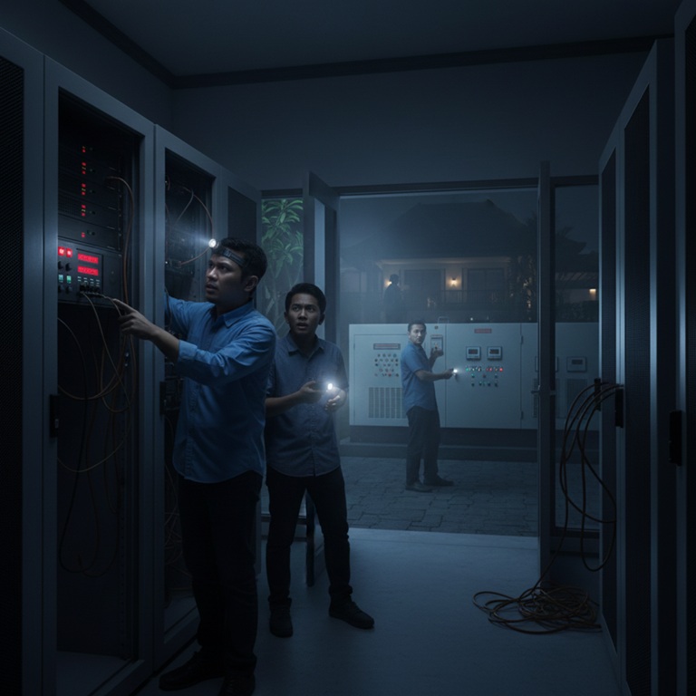 Bagi Arya, ini adalah uji coba lapangan, bukan gangguan. Tugasnya hari ini: memastikan bahwa sistem Uninterruptible Power Supply (UPS) dan Generator (Genset) bekerja mulus untuk menopang semua sistem kritis selama pemadaman, khususnya server PMS dan peralatan jaringan inti yang baru saja diselamatkan. Kegagalan daya cadangan di Bali, yang sering mengalami pemadaman, adalah bencana yang bisa terulang setiap minggu.